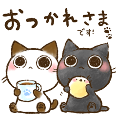 目だけでうったえる猫、言葉少なめ。『ちょこさん』の相方の黒猫『おはぎさん』です。「ちょこさん」スタンプとセットで遊べます! 【イラストレーター:タカオエリ】